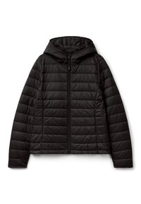 Marineblauer Steppjacke mit Kapuze, featuring einen Reißverschluss, gesteppter Design und langen Ärmeln. Das Material ist glatt und geschmeidig in der Haptik.