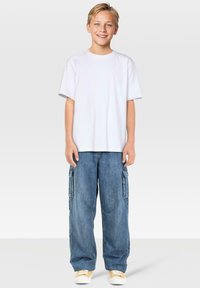 Lächelnder Junge mit kurzem blonden Haar, der ein einfaches weißes T-Shirt, lockere blaue Cargo-Jeans und gelb-weiße Sneaker trägt, vor einem grauen Hintergrund steht.