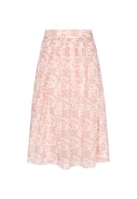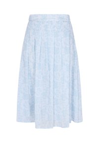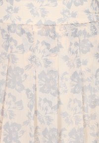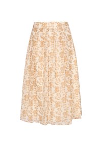Hellbeiger Midirock mit grauem Blumenmuster, hoher Taille, Falten, getragen mit beigen Wildleder-Absätzen, gezeigt an einer Person mit gekreuzten Beinen.