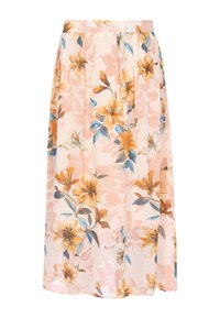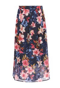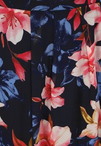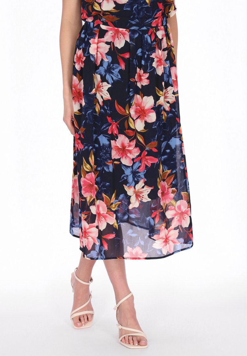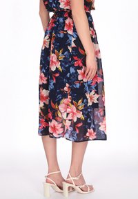 Frau in einem mittellangen marineblauen Kleid mit rosa und blauen Blumenmuster und beigen, hochhackigen Sandalen mit Riemchen, stehend auf einem weißen Boden.