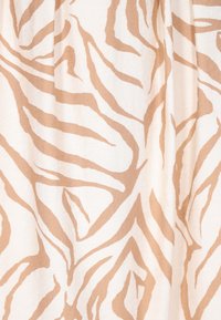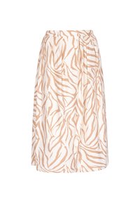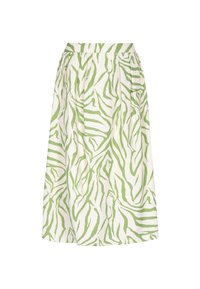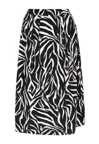 Frau trägt einen beige-weißen Midirock mit Zebramuster, kombiniert mit schwarzen High Heels, steht mit überschlagenen Beinen.