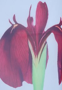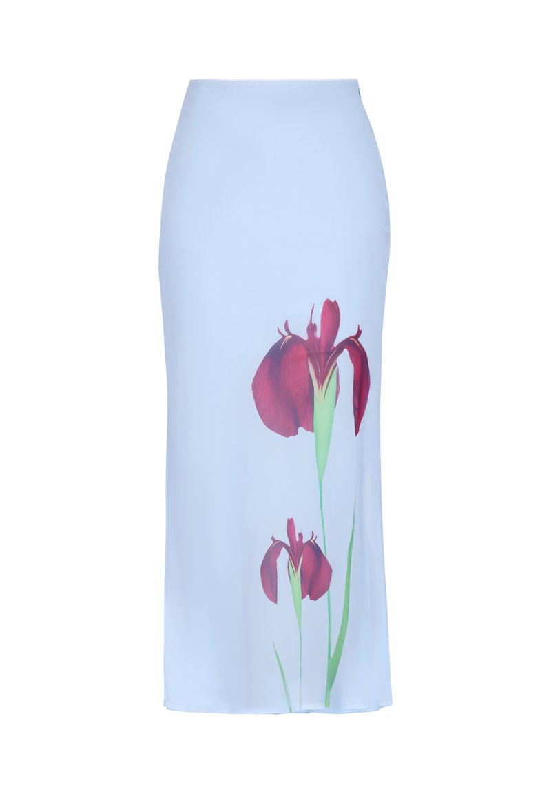 Hellblauer Midirock mit zwei großen, dunkelroten Schwertlilienblüten und grünen Stielen, die nahe dem Saum auf einer Seite gedruckt sind.
