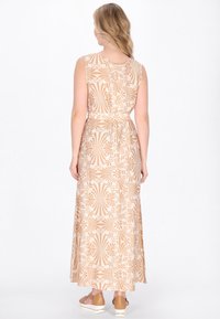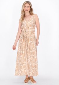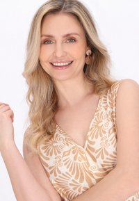 Frau in einem ärmellosen Maxikleid mit beigem und weißem Blumenmuster, V-Ausschnitt und braunen Keilsandalen, die mit verschränkten Armen posiert.
