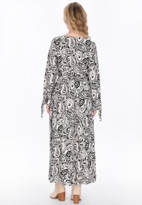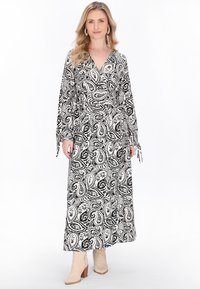 Lächelnde Frau in einem langen schwarz-weiß gemusterten Paisley-Kleid mit langen Ärmeln und beigen Stiefeln mit Absatz, die mit einer Hand in der Hüfte steht.