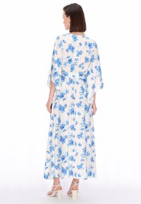 Frau trägt ein weißes knöchellanges Kleid mit blauem Blumenmuster, weiten Ärmeln und einem gebundenen Taillengürtel, kombiniert mit beigen Riemchensandalen.