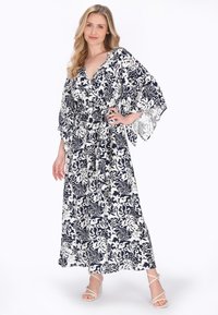 Frau trägt ein schwarz-weiß geblümtes Maxikleid mit weiten Ärmeln und Taillengürtel, kombiniert mit beigen Riemchen-Absatzschuhen.