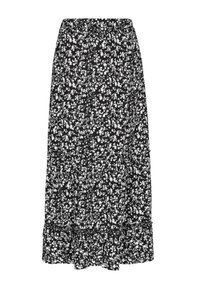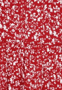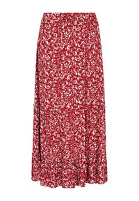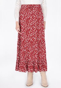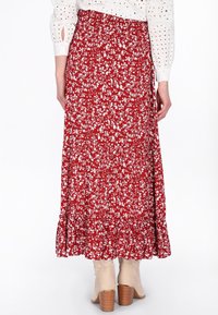 Frau trägt einen roten, knöchellangen Rock mit Blumenmuster, eine weiße, langärmelige Bluse mit Lochstickerei und hellbeige Stiefeletten vor weißem Hintergrund.