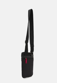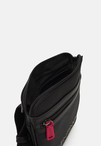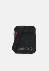 Schwarze Umhängetasche mit verstellbarem Riemen, vorderer Reißverschlusstasche und "VALENTINO"-Logo in großem und kleinerem, wiederholtem Text.