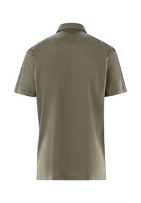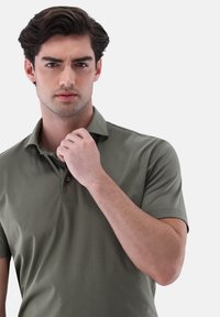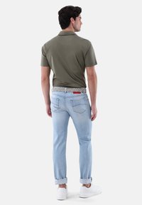 Olivgrünes Poloshirt mit umgeschlagenem Kragen, kurzen Ärmeln und einer Drei-Knopf-Leiste, kombiniert mit hellblauen Jeans und einem gemusterten Gürtel.