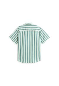 Kurzärmeliges, weißes Hemd mit grünen vertikalen Streifen und Knopfleiste; verfügt über eine Brusttasche, lockere Passform und weiche Baumwollstruktur.