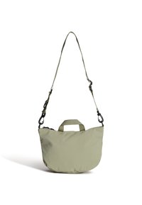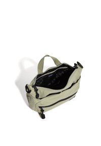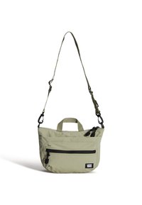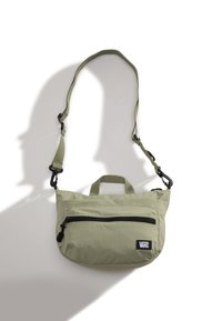 Hellgrüne Vans-Umhängetasche mit vorderer Reißverschlusstasche, schwarzen Reißverschlusszügen und verstellbarem Riemen vor weißem Hintergrund.