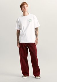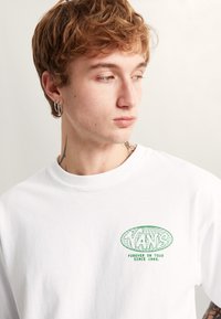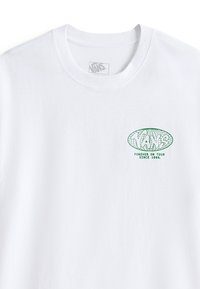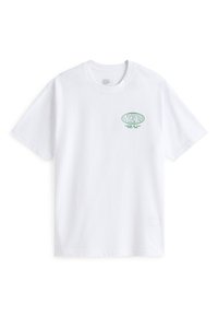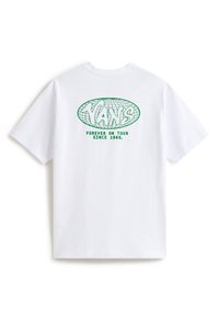 Weißes Baumwoll-T-Shirt mit einem grünen Globus-Graphic, auf dem "VANS" und darunter "FOREVER ON TOUR SINCE 1966" steht, abgebildet auf der Rückseite.