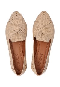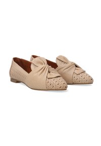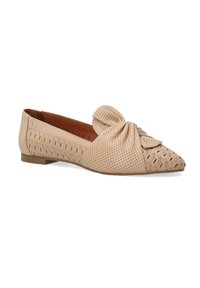 Beigefarbene Mokassins aus zartem Kalbsleder, die in Kombination mit auffälligen Perforationen diesem Modell einen markanten Stil verleihen. Die mandelförmige Spitze streckt optisch den Fuß, und die weiche Leder-Innensohle sorgt den ganzen Tag über für Komfort. Auch die dekorative Schleife auf dem Obermaterial zieht Aufmerksamkeit auf sich und verleiht dem Gesamtbild eine subtile Eleganz. Dank ihres vielseitigen Designs sind sie sowohl für Alltagsoutfits als auch für formellere Anlässe perfekt geeignet.