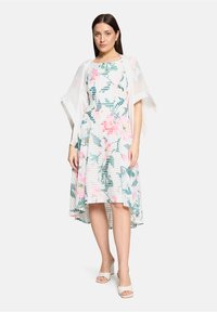 Blumenkleid mit pinken und grünen Mustern, plissierter Struktur und einer weißen, transparenten Jacke mit offenem Vorderteil.