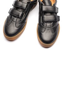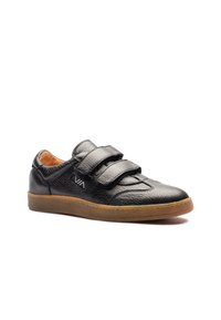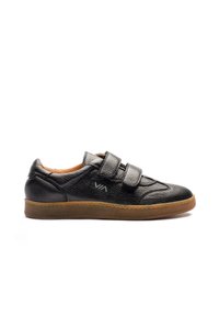 Schwarzer Lederschuh mit strukturierter Oberfläche, ausgestattet mit zwei verstellbaren Riemen und einer braunen Gummisohle. Einfaches Design, flache Form.