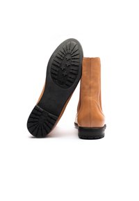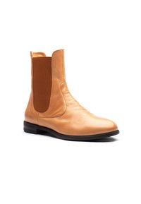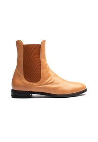 Braune Leder-Ankle-Boots mit elastischen Seitenpanelen, glatter Oberfläche, runder Zehenform und niedriger schwarzer Gummisohle.