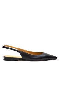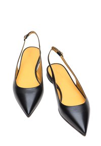 Schwarzer Leder-Slingback-Flachschuh mit spitz zulaufender Spitze, niedrigem Absatz und verstellbarem Riemen, in Seitenansicht vor weißem Hintergrund.