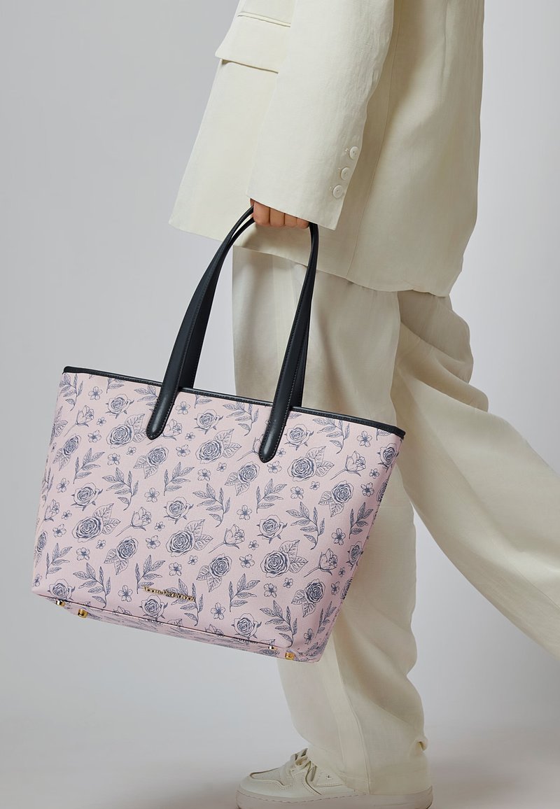 Person in cremfarbener Anzug hält große rosa Handtasche mit schwarzem Blumenmuster und schwarzen Griffen und geht vor einem einfarbigen Hintergrund.