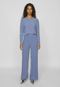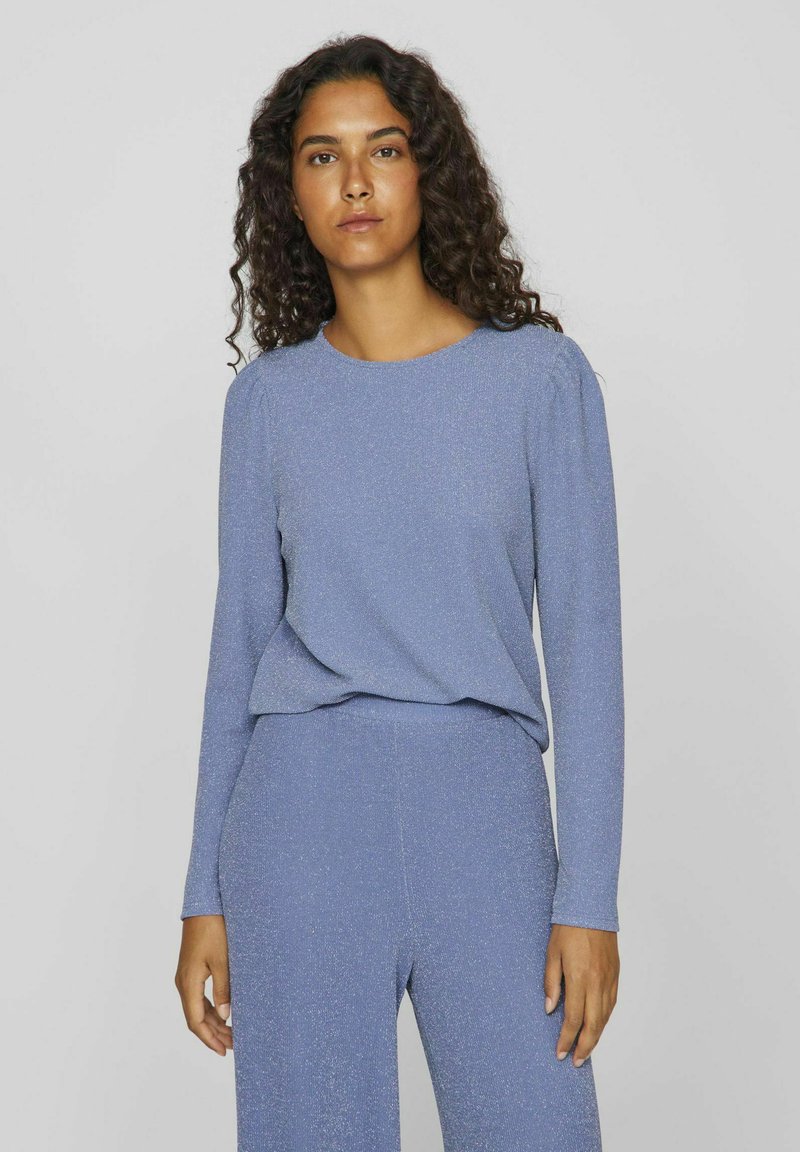 Schimmerndes, hellblaues Langarmoberteil mit Rundhalsausschnitt, weichem Material und leicht gepufften Schultern, kombiniert mit passenden Hosen.