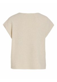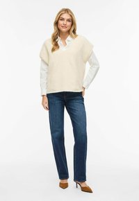 Cremefarbenes, weiches ärmelloses Oberteil aus Wollmischung mit V-Ausschnitt und breiten Schultern, über einem weißen Hemd mit Kragen getragen, kombiniert mit dunklen Jeans.