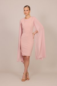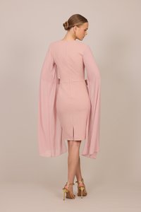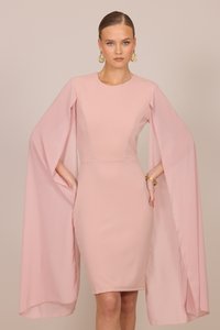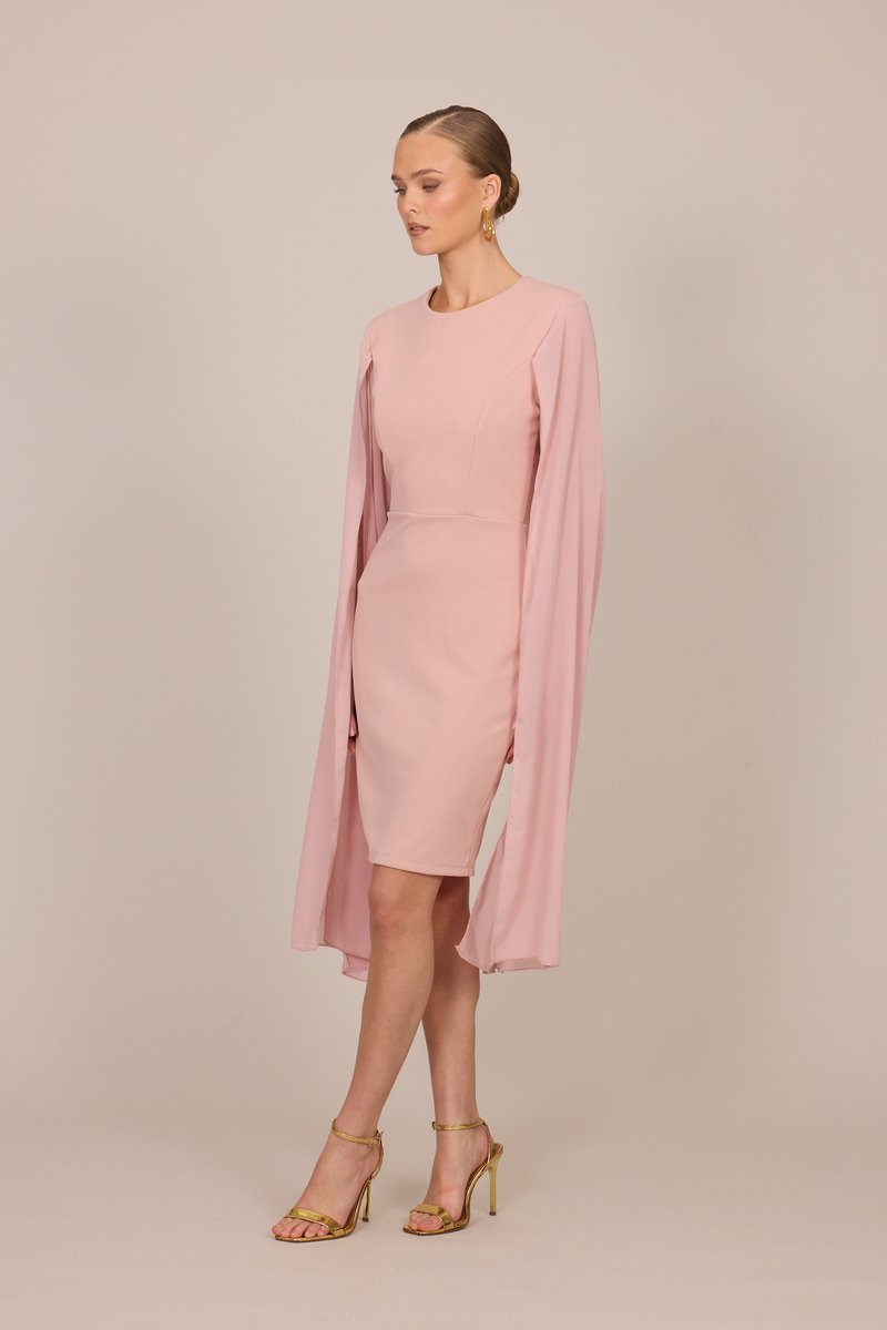 Frau trägt ein knieumspieltes, roséfarbenes Kleid mit langen, fließenden Umhangärmeln und goldenen Sandalen mit hohen Absätzen, steht vor einem schlichten Hintergrund.