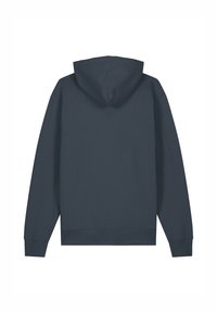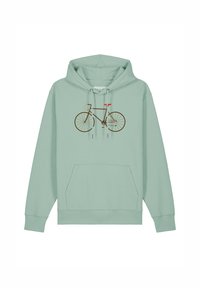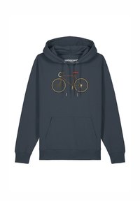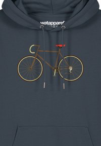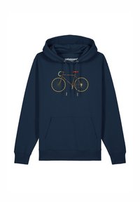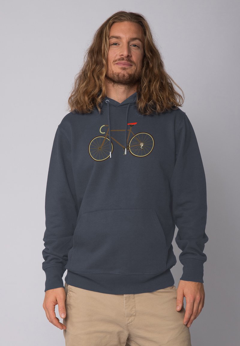 Navy Hoodie aus weichem Stoff, mit einem grafischen Motiv eines Fahrrads in Gold und Rot auf der Vorderseite, mit einer Kängurutasche und Kapuze mit Kordelzug.