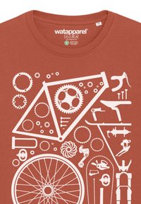 Rostfarbener Sweatshirt mit einem weißen Grafikdesign, das Fahrradwerkzeuge, Zahnräder und ein Rad zeigt, strukturierten Stoff und gerippte Bündchen.