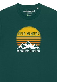 Grünes Baumwoll-T-Shirt mit einem Grafikdesign von Bergen, einer Sonne und deutschem Text. Kurze Ärmel und ein Rundhalsausschnitt.