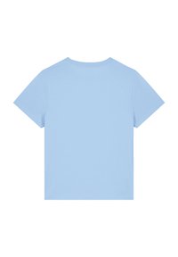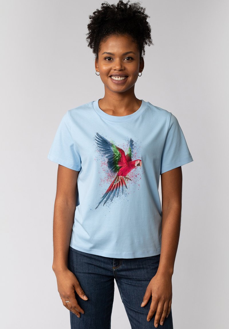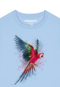 Helles blaues Baumwoll-T-Shirt mit einem bunten Papageien-Design in Rot-, Grün- und Blautönen. Kurzarm und Rundhalsausschnitt.