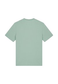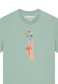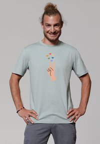 Himmelblaues Kurzarm-T-Shirt mit einem Handgesten-Grafik in Pfirsichfarbe und bunten Herzen darüber, aus weichem Baumwollstoff hergestellt.