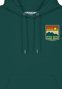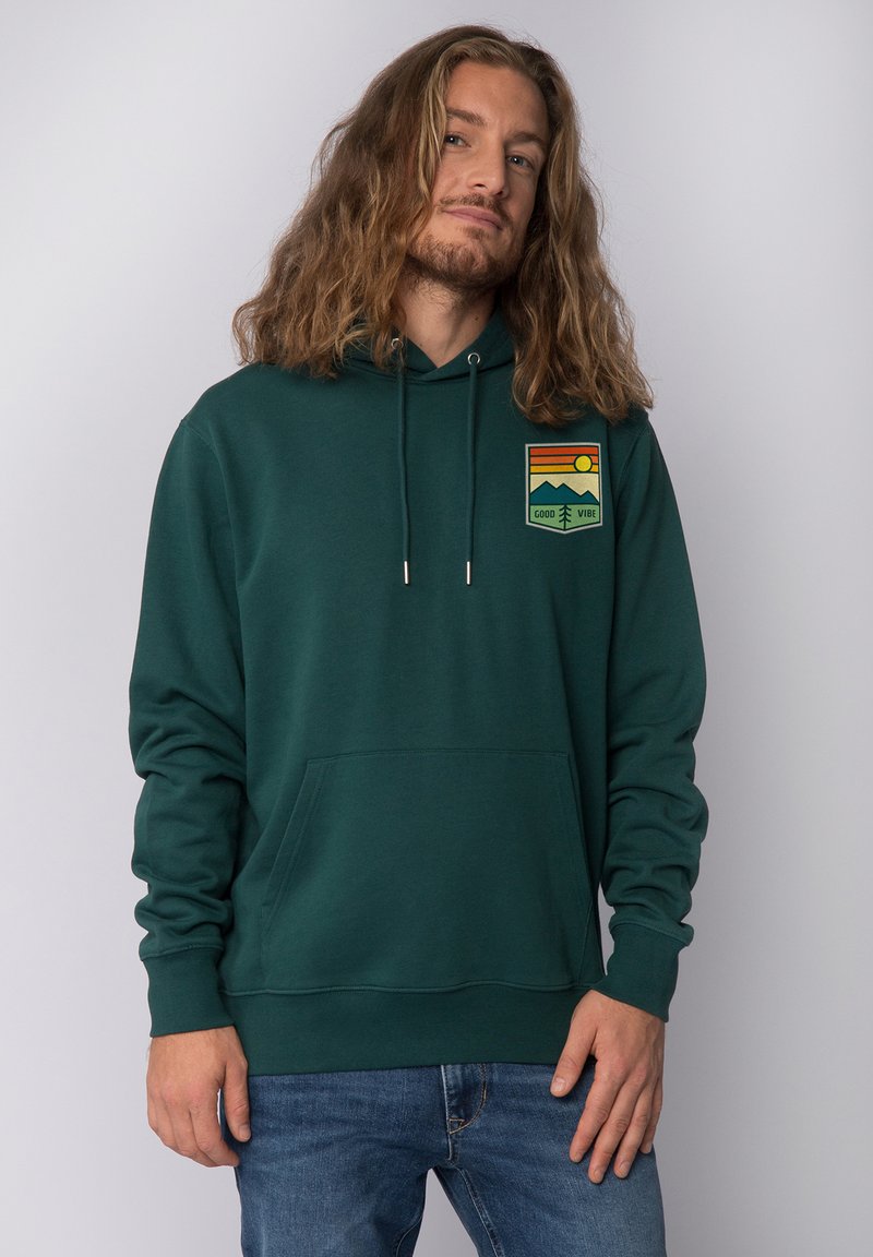 Grüne Kapuzenjacke aus weichem Material, mit einer Fronttasche, Kordelzug-Kapuze und einem bunten Grafiklogo mit Bergen sowie der Aufschrift "GOOD VIBE."