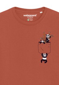 Rost-orange Sweatshirt aus Baumwolle, mit einem grafischen Taschendesign mit cartoonhaften Pandas und Essstäbchen. Rippbündchen an den Ärmeln und am Kragen.