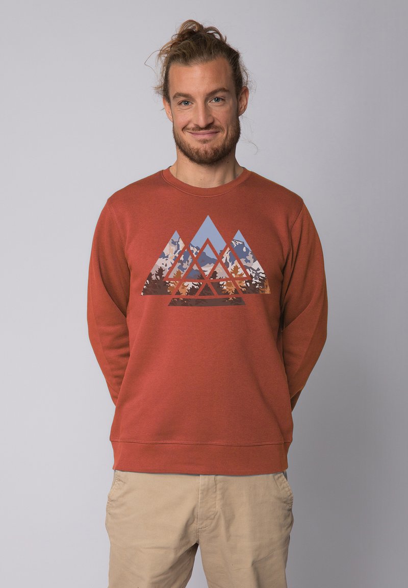 Rustfarbenes Sweatshirt mit Rundhalsausschnitt, das ein geometrisches Bergmotiv in Blau, Braun und Weiß zeigt. Aus weichem Baumwollmaterial gefertigt.