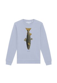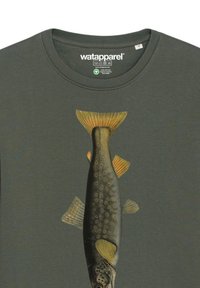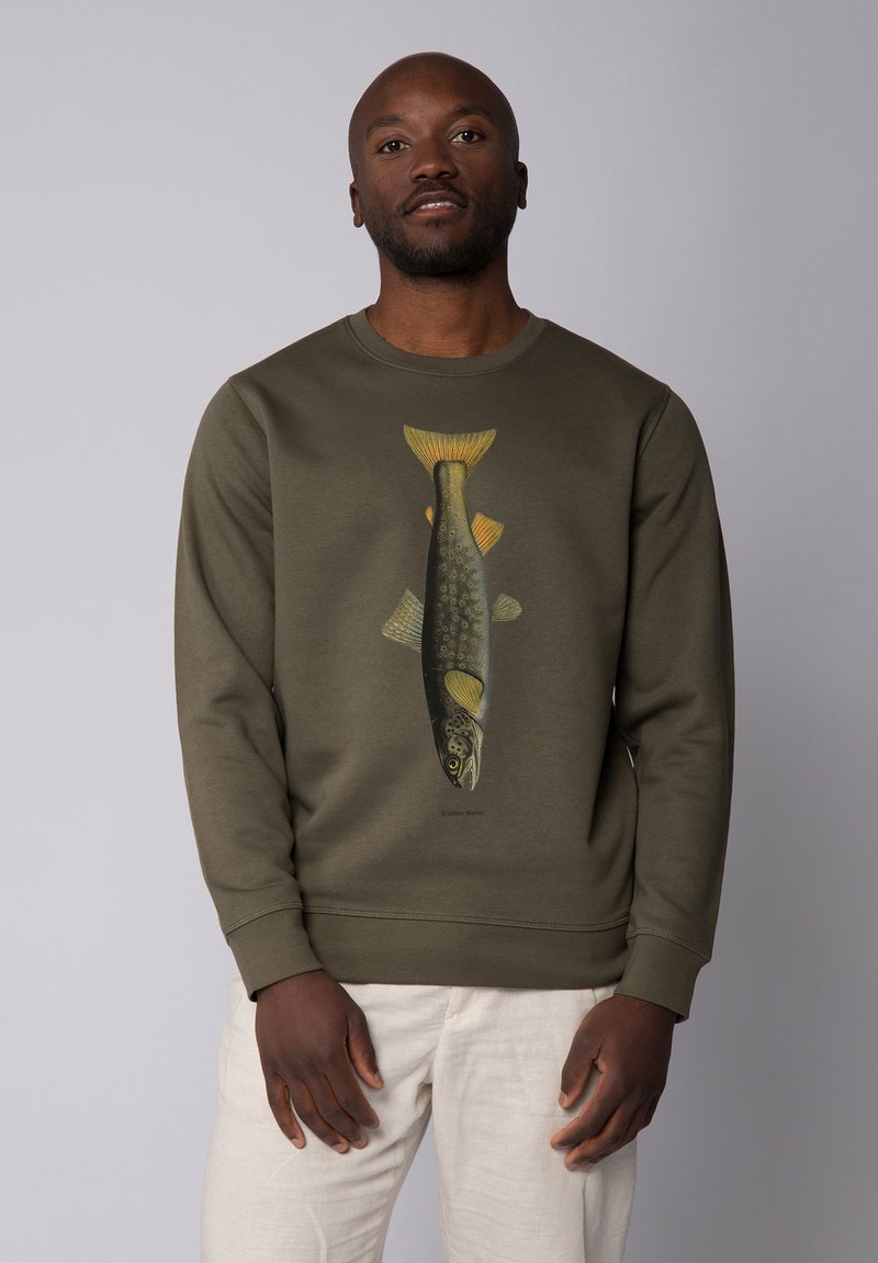 Olivegrüner Sweatshirt aus Baumwolle mit einem Fischgrafikdruck auf der Vorderseite; verfügt über einen runden Ausschnitt und gerippte Bündchen.