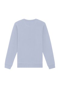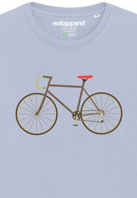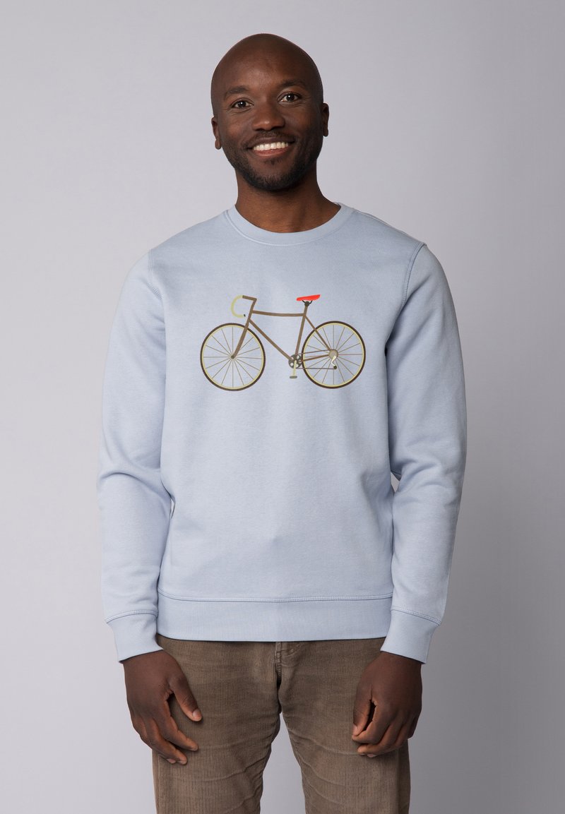 Helles blaues Sweatshirt mit einer Fahrrad-Grafik, das einen braunen Rahmen und grüne Lenker zeigt, ergänzt durch einen roten Sitz. Weiche Textur und Rundhalsausschnitt.