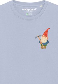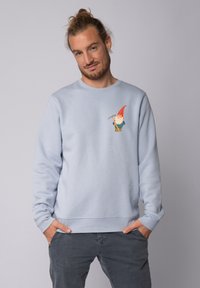 Helle blaue Sweatshirt mit einem bunten Gartenzwerg-Motiv auf der Brust. Weicher Stoff, runder Ausschnitt und gerippte Bündchen und Saum.