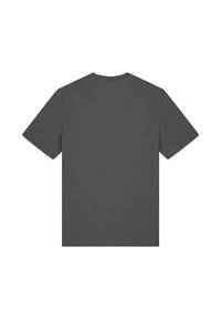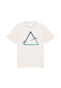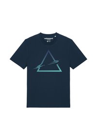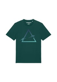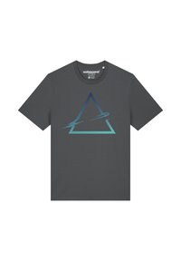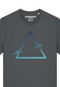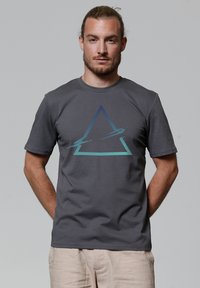 Graues Baumwoll-T-Shirt mit einem blau-grünen dreieckigen Grafikdesign und einer geschwungenen Linie, kurzen Ärmeln und einem klassischen Rundhalsausschnitt.
