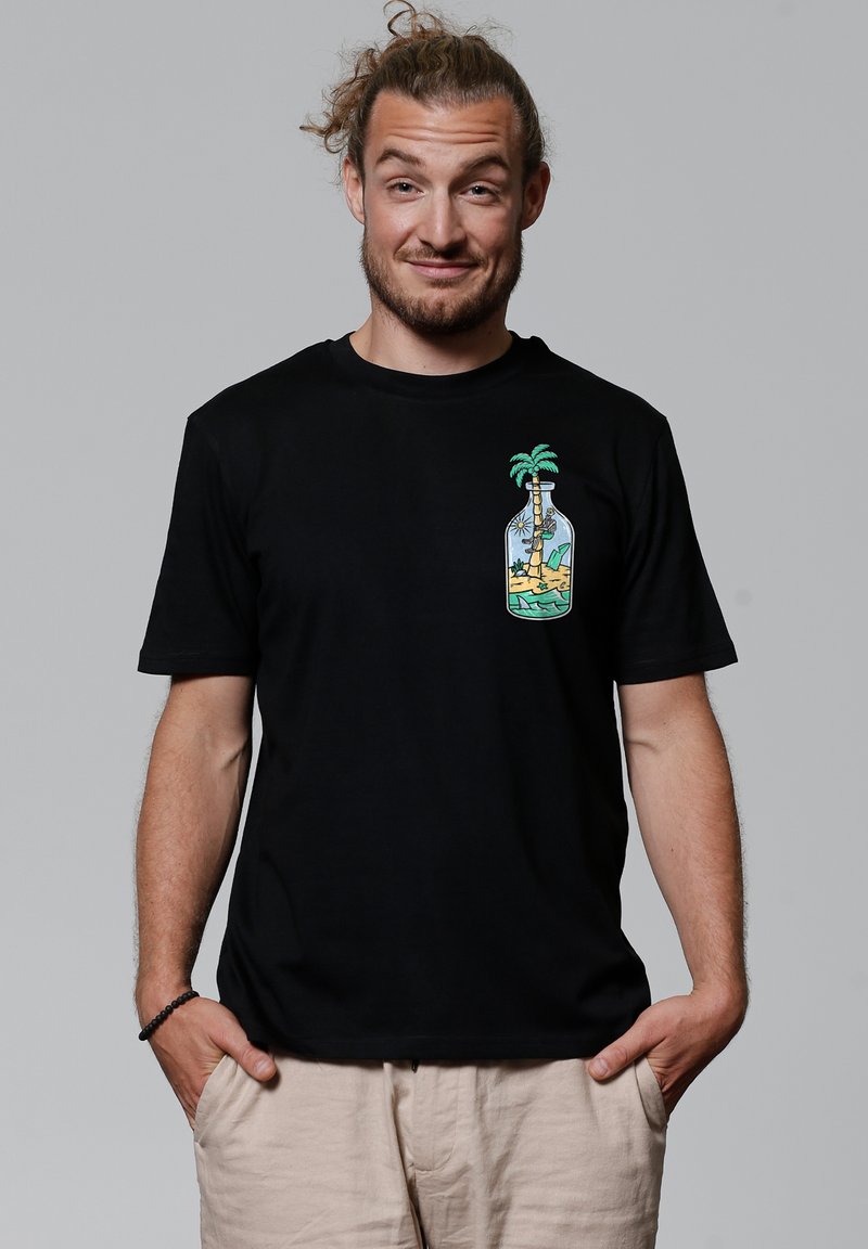 Schwarzes Baumwoll-T-Shirt mit Rundhalsausschnitt und kurzen Ärmeln, das ein farbenfrohes Palmenbaumdesign innerhalb einer Flasche auf der linken Brusttaschenfläche zeigt.