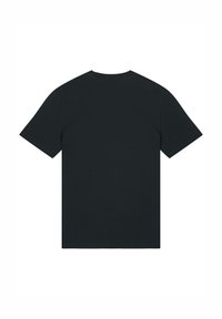 Schwarzes T-Shirt mit kurzen Ärmeln, das auf der Vorderseite ein großes grünes Monstera-Blatt-Design zeigt. Das Material sieht weich und glatt aus.