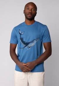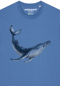 Blaues Baumwoll-T-Shirt mit einem Grafikmotiv eines Wals in Blau- und Grautönen, Rundhalsausschnitt und kurzen Ärmeln.