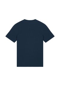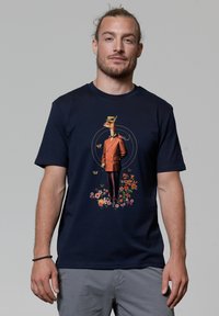 Navys-blaues T-Shirt mit einem verspielten Grafikdesign eines gekleideten Giraffen in Anzug mit Blumen, Schmetterlingen und einem Stock, gedruckt in lebhaften Farben.