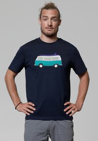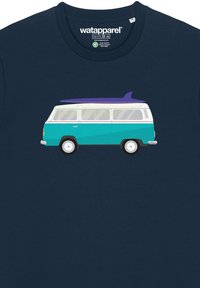 Marineblaue Baumwoll-T-Shirt mit einem Grafikmotiv eines türkisfarbenen Vintage-Vans mit einem Surfbrett auf dem Dach. Kurze Ärmel, Rundhalsdesign.