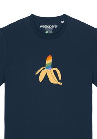 Navyblaues Baumwoll-T-Shirt mit einem zentralen Grafikdesign einer Banane mit einer mehrfarbigen gestreiften Schale. Kurze Ärmel und ein klassischer Schnitt.