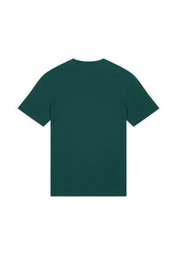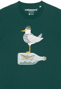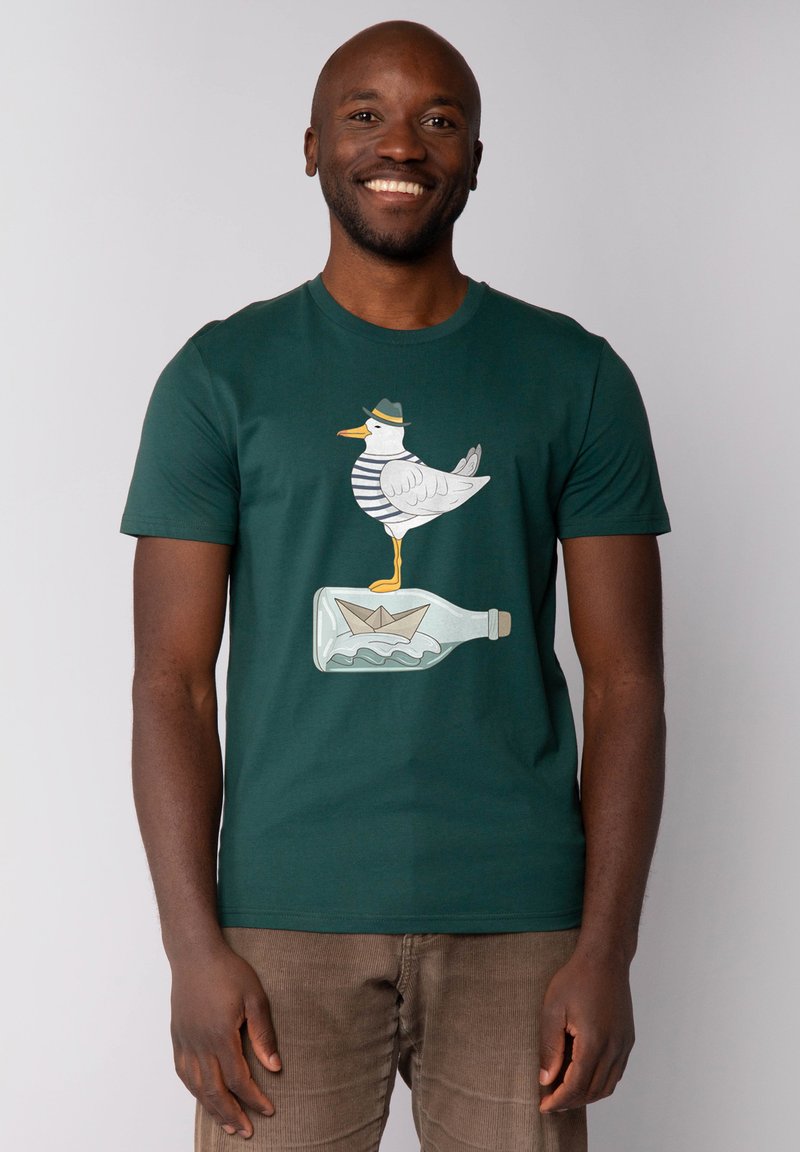 Grünes Baumwoll-T-Shirt mit einem Grafikdesign eines Möwen im gestreiften Hemd, die auf einer Flasche steht, in der ein Papierboot schwimmt.