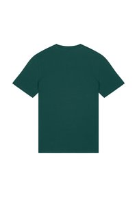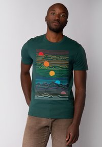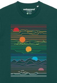 Grüne Baumwoll-T-Shirt mit einem bunten abstrakten Grafikdesign von Sonnen- und Berglinien auf der Vorderseite in Rot, Orange, Gelb, Blau und Weiß.