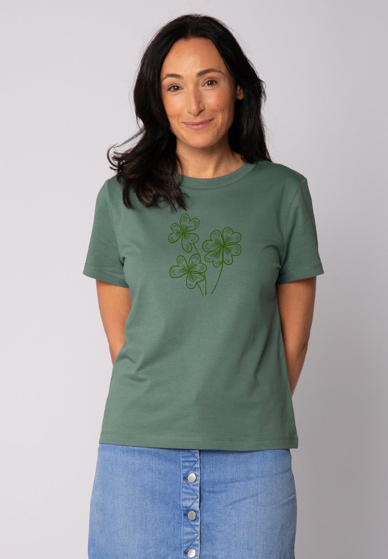 Grünes Baumwoll-T-Shirt mit einem detaillierten grünen Kleeblatt-Graphic auf der Vorderseite, kombiniert mit einem hellblauen Jeansrock und einem runden Halsausschnitt.