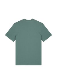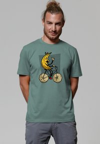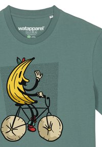Hellgrünes Baumwoll-T-Shirt mit einem Cartoon-Bananencharakter, der ein Fahrrad fährt, mit großen runden Rädern und einer verspielten Handgeste.
