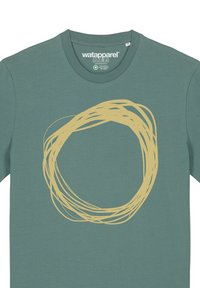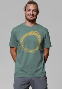 Grünes Baumwoll-T-Shirt mit einem gelben kreisförmigen Grafikdesign. Kurze Ärmel, runder Hals und ein lässiger Schnitt.