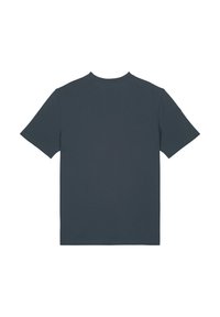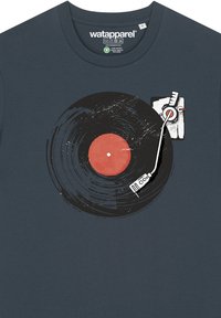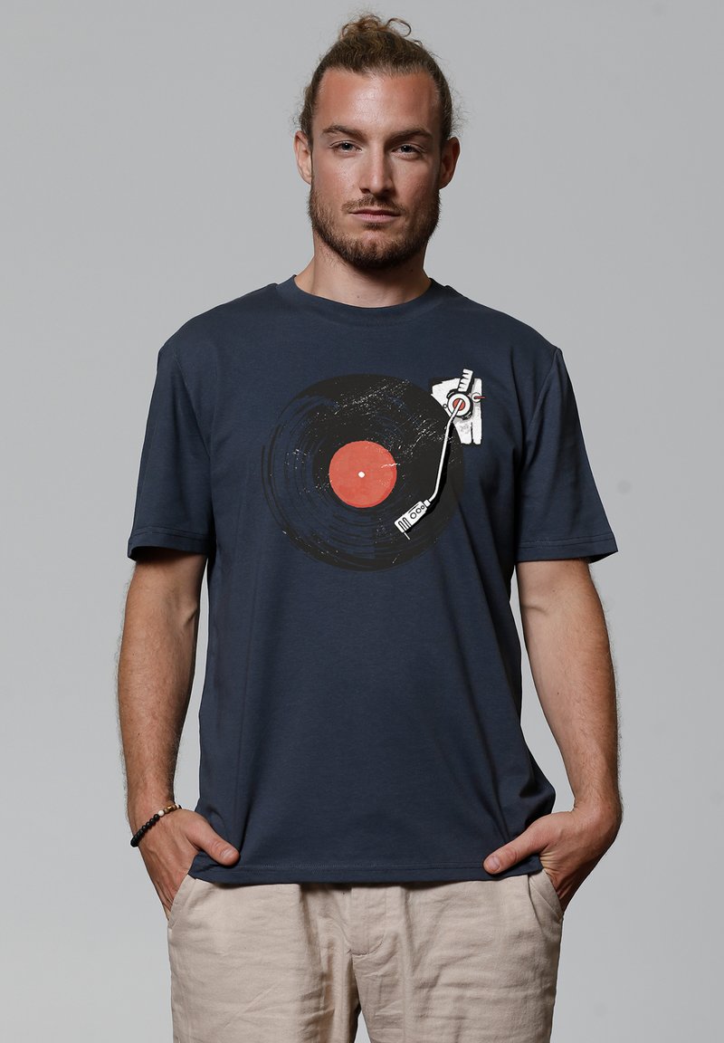 Navyblaue Baumwoll-T-Shirt mit einem Grafikmotiv einer Schallplatte mit rotem Mittelpunkt und einem Tonabnehmer, kurzen Ärmeln und lässigem Schnitt.