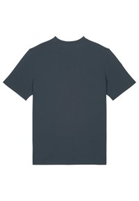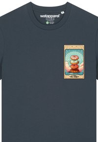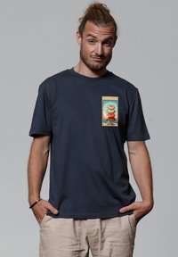 Navyblaue Baumwoll-T-Shirt mit einem bunten Grafikdruck auf der Brust, der eine Figur und einen Text zeigt, die in einem dekorativen Rahmen eingefasst sind.